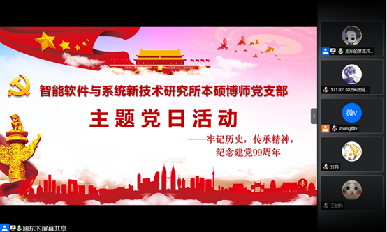 (通讯员 贺同庆)为纪念建党99周年,重温党的光辉历史,传承弘扬革命先辈的奋斗精神,计算机科学与技术学院智能软件与系统新技术研究所本硕博师联合党支部于2020年7月1日召开了“牢记历史,传承精神——纪念建党99周年”主题党日活动。本次活动由支部青年委员王旭东同志主持,活动共计39人参加,采用腾讯会议线上召开的方式进行。