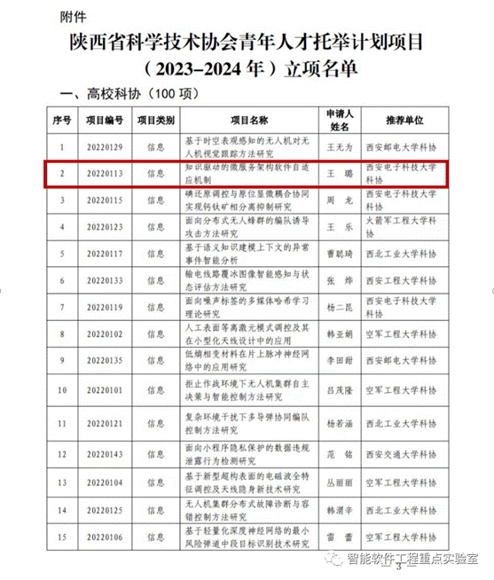 近日,陕西省科协公布了陕西省青年人才托举计划项目的评审结果,该项目旨在深入实施新时代人才强国战略,鼓励我省优秀青年科技人才投身创新型省份建设,加快创新驱动发展步伐,重点扶持、加快培养有较大发展潜力的年轻科技工作者,扶持年轻人才逐步成长为德才兼备、勇于创新的优秀科技人才,推动陕西高质量发展作出新的贡献。西安电子科技大学计算机科学与技术学院智能软件与系统技术研究所王璐副教授成功入选陕西省青年托举人才项目。