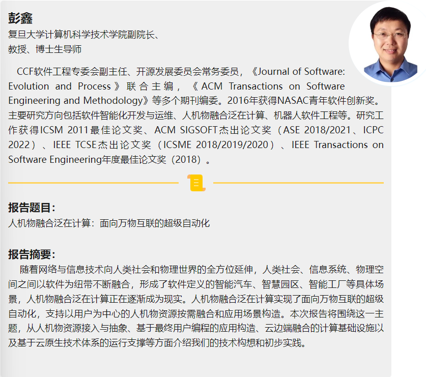 网络与信息技术的发展推动信息、社会和物理空间加速融合,带领我们进入人机物融合的泛在计算时代。由此产生的智慧城市、智能交通、智能汽车、智能工厂等人机物融合应用系统在云边端融合的计算平台支撑下以软件定义的方式实现人机物资源的按需融合,由此也带来了一系列问题和挑战。本论坛围绕人机物融合泛在计算应用系统的运行支撑以及运维保障,邀请了来自学术界和工业界的专家分享最新研究成果及实践经验,并通过panel讨论的形式探讨这一领域的未来方向。
