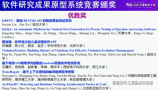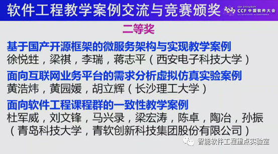 至此,2022 ccf中国软件大会优秀青年学者论坛带来了9场精彩报告,圆满结束,感谢关注!期待后续共同为我国软件事业作出贡献!同时,由重点实验室骨干教师徐悦甡副教授、蒋志平博士以及实验室副主任李瑞教授组成的团队,获得了全国软件工程教学案例竞赛二等奖与软件研究成果原型系统竞赛优胜奖。