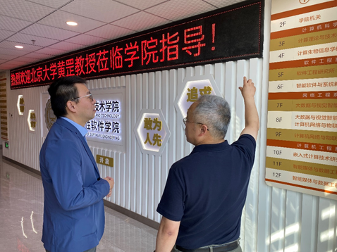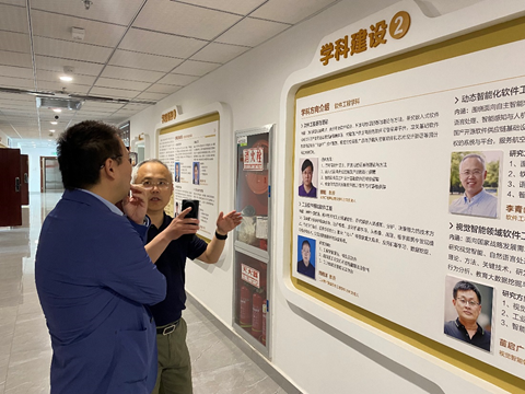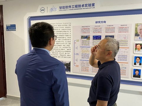 首先,黄罡教授在李青山教授陪同下,参观了计算机科学与技术学院以及市重点实验室在新启用的网络安全创新研究大楼中的文化墙建设。李青山教授讲解了学院的发展历程,介绍了学院在专业建设、学科建设、科学研究、党建创新、人才培养等方面取得的成果,黄罡教授还参观了解了智能软件与系统新技术研究所的组织结构、师资构成、各实验室代表性科研成果以及西安市智能软件工程重点实验室学术委员会等情况。