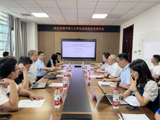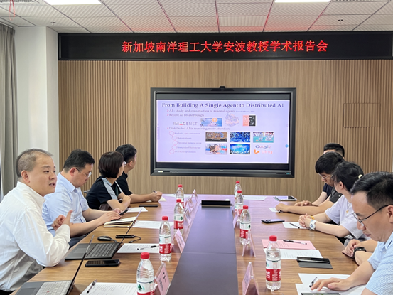 安波教授介绍了过去十多年多智能体方向的主要研究进展,提出多智能体研究从“传统优化”向“强化学习”转型的大背景下,需要建立自主、分布式的多智能体技术体系,并成体系地开展高水平应用基础研究、前沿技术探索;其次,安波教授向实验室学生介绍了南洋理工大学及其所属团队的博士后、博士攻读政策,并就实验室青年教师关心的科研问题进行了耐心解答;最后,安波教授和李青山教授就面向国家重大战略需求科研攻关、进一步拓宽科研合作、落实人才联合培养等方面进行了深入交流。