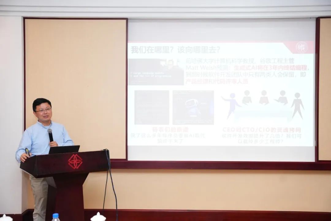 在主旨报告环节中,彭鑫教授带来了题为“大模型辅助软件开发:我们在哪里?该往何处走?”的精彩报告。彭老师首先介绍了大模型及相关的模型微调、提示工程、检索增强、多agent等技术的发展,强调这些技术的进步正在助推软件开发进入智能化时代。彭老师指出,局部化的智能辅助支持实现了一定程度上的软件开发效率提升,但大模型技术的发展难以触发软件智能化开发的质变。针对软件应用开发,彭老师建议探索如何将演进式设计、特定领域语言以及有效的代码审视与反馈与大模型的代码生成能力相结合。针对复杂软件维护,彭老师提出构建与代码同步演化的代码数字孪生,并通过大模型强大的知识抽取、关联与利用能力实现软件开发知识的有效积累。