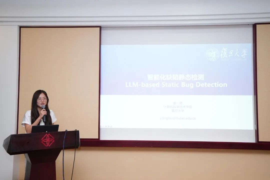 娄一翎副研究员以“智能化静态缺陷检测”为题进行了分享。娄老师首先分析了传统静态缺陷检查方法在代码复杂性高以及业务逻辑特定的场景中,常面临召回率、精准率不足的问题。娄老师表示,人工智能尤其是大语言模型的发展为静态缺陷检测带来了新的机遇。娄老师接着分享了他们近期基于智能化方法的静态缺陷检测工作,即通过利用缺陷历史构建缺陷知识库,以增强大语言模型静态缺陷检测的能力,同时结合大语言模型和静态分析的互补性,设计出大语言模型和静态分析相结合的缺陷静态检测方法。