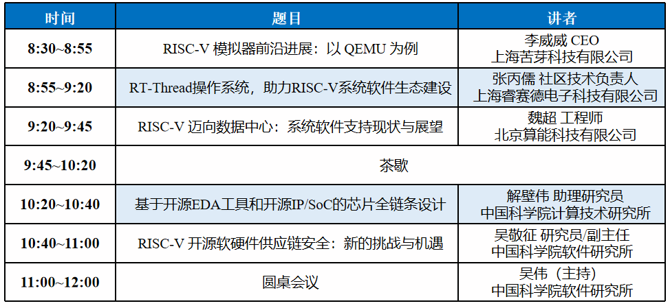 本论坛旨在召集risc-v产业界的商业、教育及技术领袖人物、开源社区专家、独立软件商代表,深入交流对未来三至五年的risc-v系统软件及软硬协同的发展趋势、科研挑战、技术难点、商业机遇、正在和即将面对的共性问题,促进risc-v在国内的发展。欢迎risc-v生态、软件分析、软件工程、系统软件、信息安全、人工智能等学科的专家和学者前来参加。