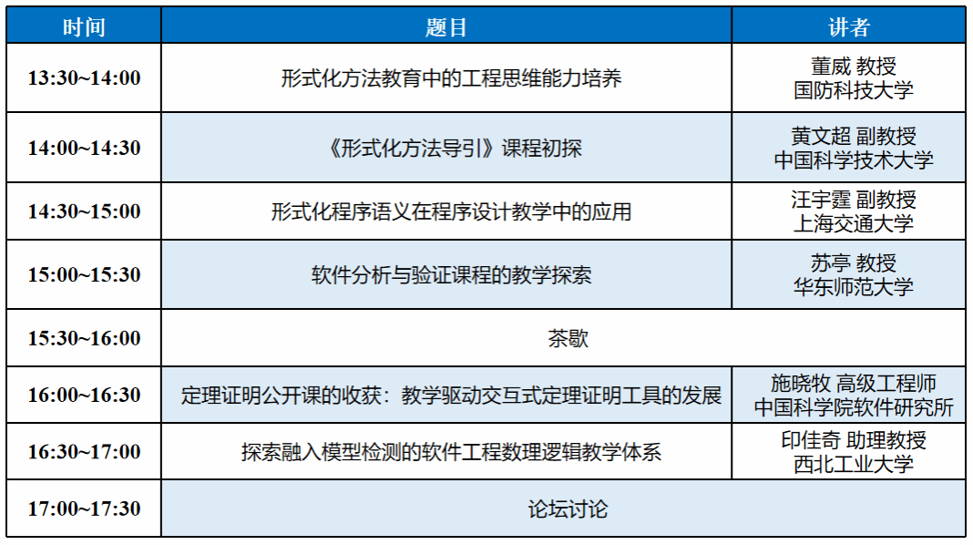 形式化方法教学在信息类学科教育中的重要性不言而喻。但是,此类课程对于多数学生而言,具有内容抽象、知识点繁杂、应用难度大、学习曲线陡等特点。这对从事形式化相关课程教学的教师提出了挑战。近来,有关我国的形式化方法教育现状调查结果指出,亟待加强专业教育中形式化方法的教学内容和改革。为此,chinasoft每年组织形式化方法教育论坛,旨在交流形式化方法相关课程的教学经验,探讨在计算机科学技术和软件工程等相关学科教学中加强形式化方法教育的途径,以促进形式化方法课程的教学发展。