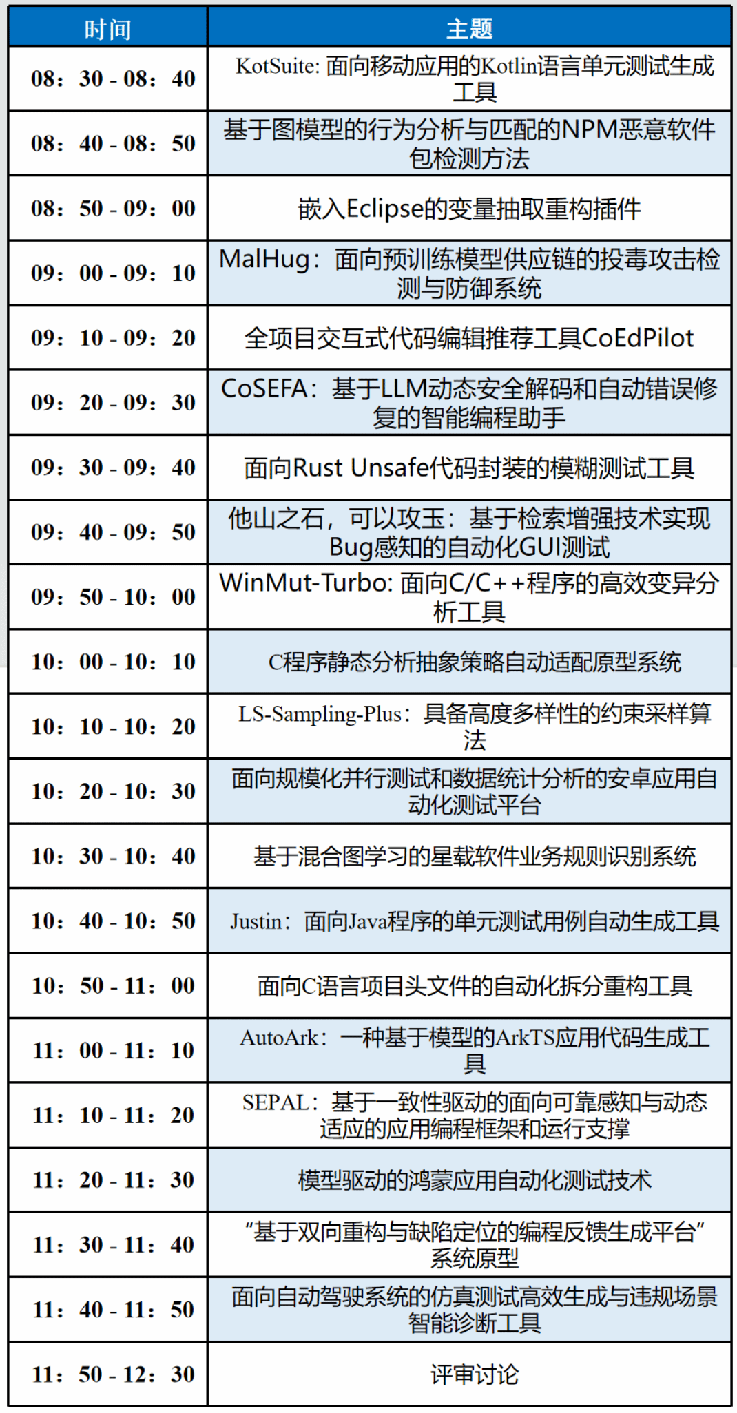 主席: 刘辉(北京理工大学) 胡星(浙江大学) 夏鑫(华为)成员: 董震(复旦大学) 冯洋(南京大学) 高翠芸(哈工大深圳) 高祥(北京航空航天大学) 高志鹏(浙江大学) 贺品嘉(港中文深圳) 姜艳杰(北京大学) 晋武侠(西安交通大学) 梁广泰(华为) 刘逵(华为) 刘烨庞(南方科技大学) 孙泽宇(中科院) 石琳(北京航空航天大学) 王博(北京交通大学) 王俊杰(中科院) 王焱林(中山大学) 文明(华中科技大学) 谢晓园(武汉大学) 鄢萌(重庆大学) 张宇霞(北京理工大学)