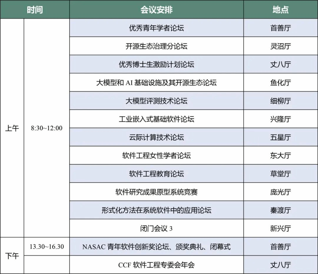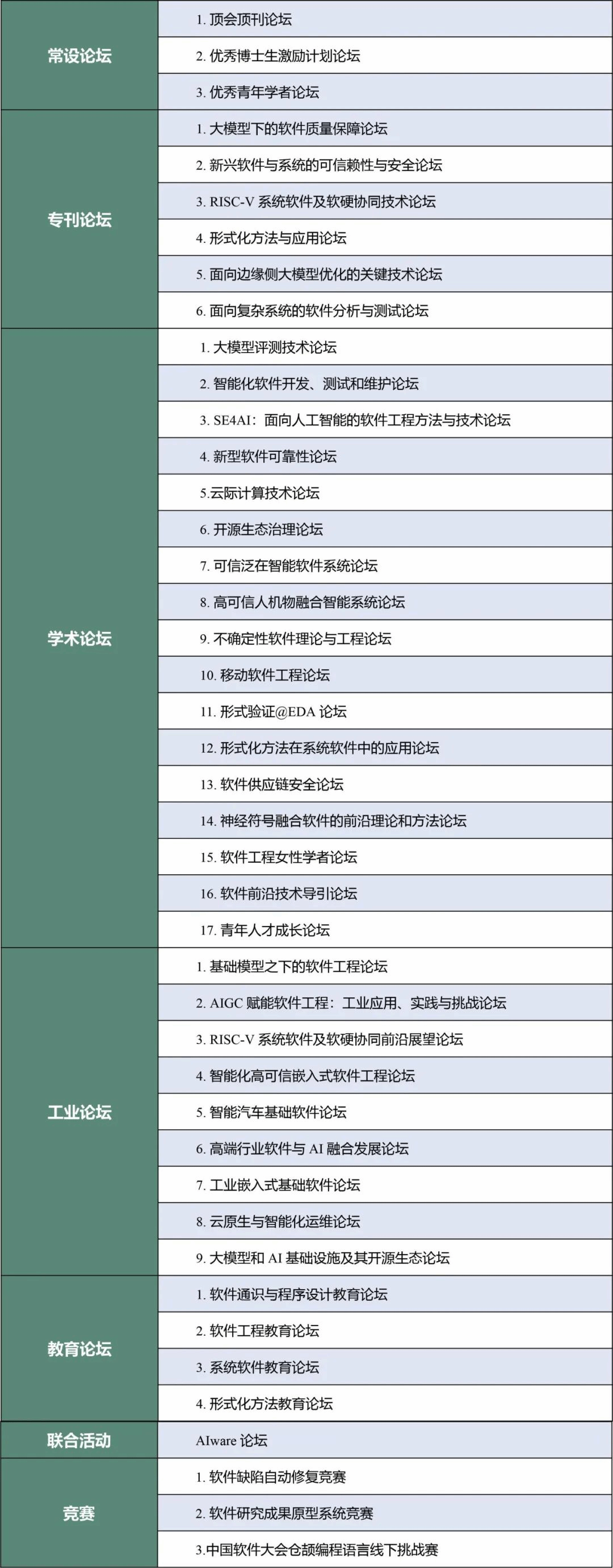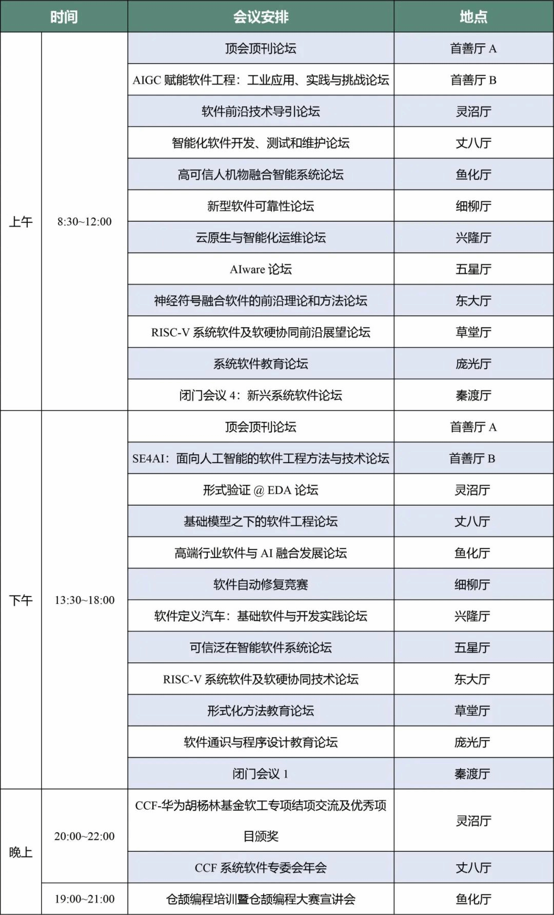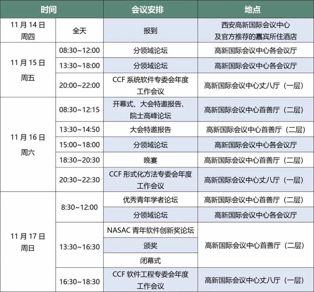 ccf中国软件大会由全国软件与应用学术会议(nasac)与全国形式化方法与应用会议(fmac)两个会议有机组成。nasac创立于2002年,已举办二十二届,由ccf主办,ccf软件工程专业委员会与ccf系统软件专业委员会共同承办,是中国软件科学与工程相关领域参会人数最多、影响范围最广、涵盖内容最全面的学术会议。全国形式化方法与应用会议(fmac)创立于2016年,历经八届,由ccf主办,ccf形式化方法专业委员会承办。fmac聚焦形式化方法理论前沿和最新研究进展,深化拓展形式化方法与相关领域的交叉,促进形式化方法、工具和应用在国内的发展。
