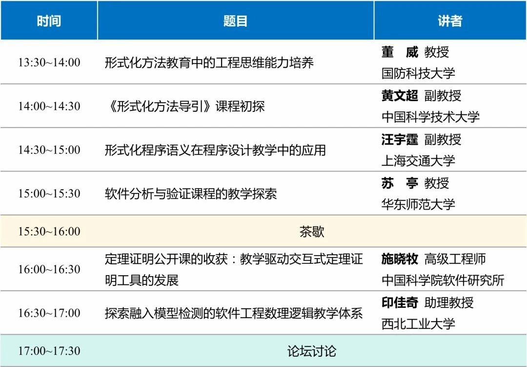 形式化方法教学在信息类学科教育中的重要性不言而喻。但是,此类课程对于多数学生而言,具有内容抽象、知识点繁杂、应用难度大、学习曲线陡等特点。这对从事形式化相关课程教学的教师提出了挑战。近来,有关我国的形式化方法教育现状调查结果指出,亟待加强专业教育中形式化方法的教学内容和改革。为此,chinasoft每年组织形式化方法教育论坛,旨在交流形式化方法相关课程的教学经验,探讨在计算机科学技术和软件工程等相关学科教学中加强形式化方法教育的途径,以促进形式化方法课程的教学发展。