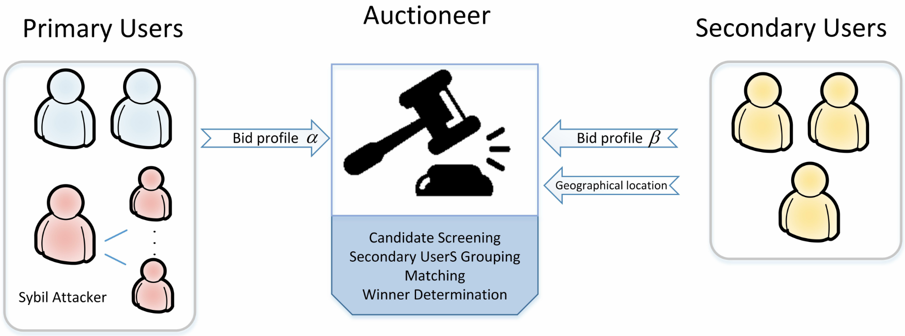 董学文副教授的论文“towards primary user sybil-proofness for online spectrum auction in dynamic spectrum access”主要研究了在5g网络中的频谱资源分配问题。目前,动态频谱接入(dynamic spectrum access, dsa)是大量无线设备涌现造成频谱短缺问题的有效凯发k8登录的解决方案,其中基于拍卖的频谱分配机制因其良好的分配效率和公平性而受到广泛的研究。然而,在拍卖过程中存在一种名为sybil攻击(即女巫攻击)的攻击形式,一个恶意用户通过使用两个或多个假身份同时参与竞拍以获利。这种攻击会影响拍卖结果并且会严重损害诚实用户及竞拍机构的利益。现有的抗sybil攻击的频谱拍卖机制只针对次级用户的攻击,但是在主次用户同时参与拍卖的双向频谱拍卖机制中,主用户也可以通过sybil攻击获利。为此,该文提出一种可以对抗主用户sybil攻击的在线双向频谱拍卖机制tsunami。tsunami通过计算次级用户的机会成本筛选出其中部分性价比高的次级用户参与频谱分配,设计报价无关的排序方式和顺序匹配方法来实现主用户的抗sybil攻击性和真实性,并且在最后进行了大量的仿真实验验证了tsunami满足这些期望的性能。