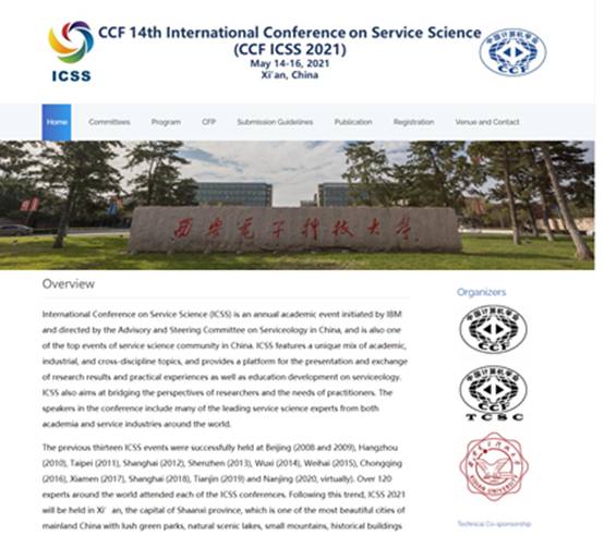 中国计算机学会第14届服务科学国际会议(ccf 14th international conference on service science)将于2021年5月14日~16日在西安举行。本次会议由中国计算机学会服务计算专委会主办,西安电子科技大学计算机科学与技术学院承办。本次会议也是西安电子科技大学软件工程学科2021年举办的学术活动之一。